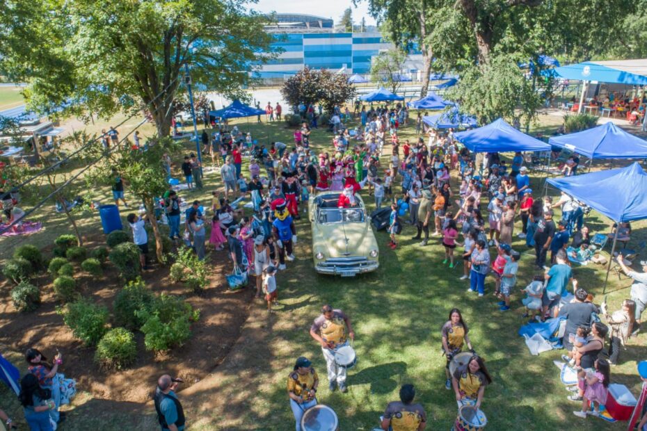 Uno de los momentos más esperados de la tarde fue la llegada del Viejito Pascuero, quien ingresó al recinto en un auto clásico, acompañado por una batucada que recorrió el trayecto desde el estacionamiento del Aula Magna hasta el sector de entrega de regalos. Allí, niñas y niños pudieron compartir con él y tomarse fotografías en un trineo especialmente dispuesto para la ocasión.